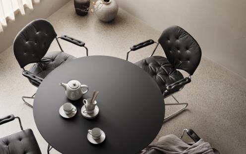 Round café table that encourages conversation and eye contact with all guests. Also available as a dining table or a dining table with two extendable sections.